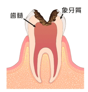 むし歯がエナメル質の下の象牙質まで到達した状態です。