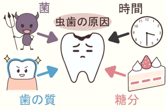 主に3つが挙げられます。これに歯垢のついている時間の経過がプラスされ、むし歯になりやすい歯になってしまいます。